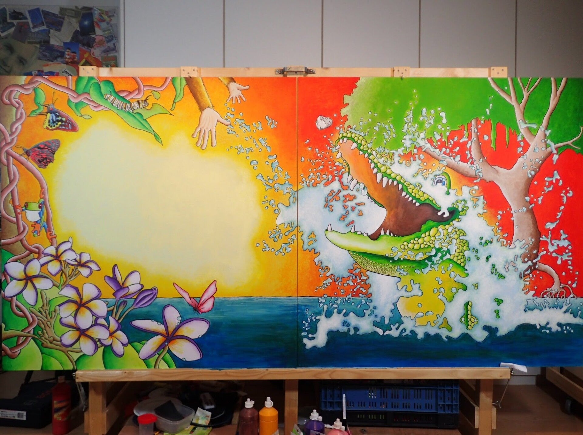 Voor kinderen maak ik momenteel een reuzenprentenboek over Meneertje Nogeenkeertje, een fantasiediertje dat maar niet wil gaan slapen omdat hij zijn avonturen in de jungle zo leuk vindt dat hij ze allemaal nog een keer wil beleven.